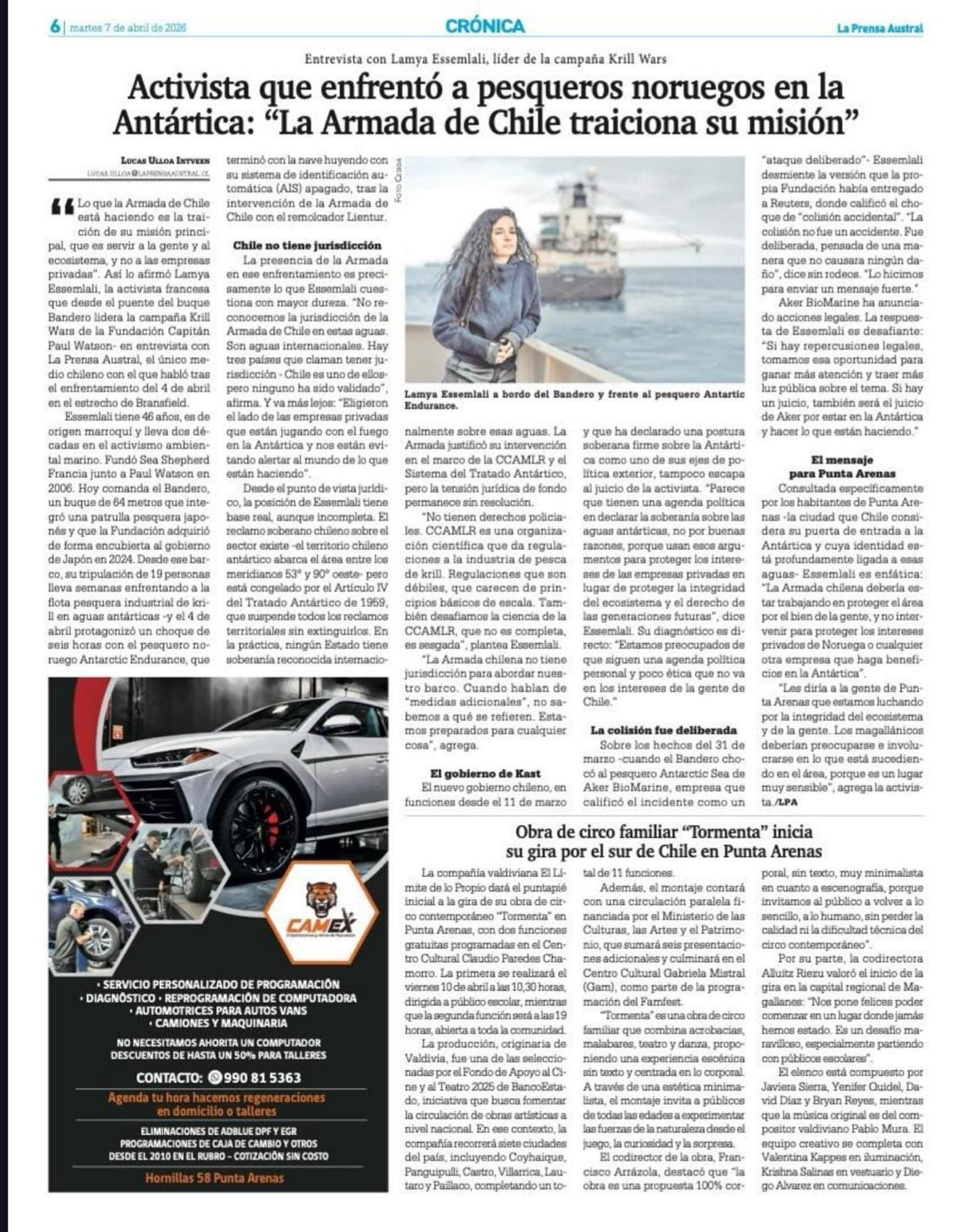This is what Lamya Essemlali, the French activist who, from the deck of the ship Bandero, leads the Krill Wars campaign of the Captain Paul Watson Foundation, stated in an interview with La Prensa Austral, the only Chilean media outlet she spoke to about the confrontation on April 4 in the Bransfield Strait.